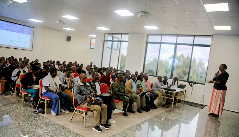 Abitabiriye amahugurwa bari guhugurwa n'itsinda ry'abakozi barimo uwo mu Kigo cy’Igihugu gishinzwe kwita ku buzima, Minisiteri y’Ubutegetsi bw’Igihugu n’Ikigo cy’Igihugu gishinwe Indangamuntu.