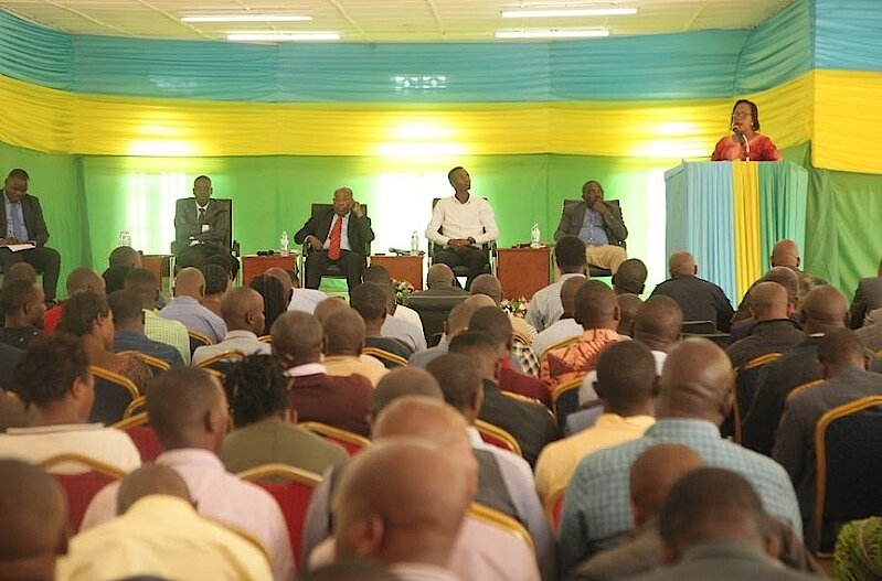 Guverineri w'Intara y'Amajyaruguru, Bwana MUGABOWAGAHUNDE Maurice ni we wari umushyitsi mukuru muri ibi biganiro. Yakiriwe, anahabwa ikaze n'Umuyobozi w'Akarere, Mme MUKAMANA Soline.