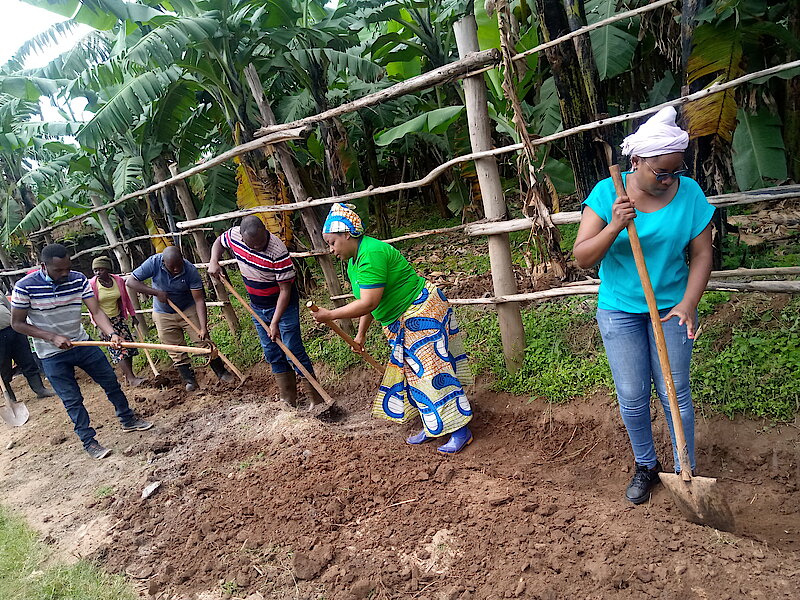 Umuyobozi w’Akarere wungirije ushinzwe imibereho myiza y’Abaturage, Bwana MWANANGU Theophile; ari hamwe n'Abajyanama mu Nama Njyanama y'Akarere, Umunyamabanga Nshingwabikorwa w'Umurenge wa Kinoni n'Inzego z'umutekano bifatanyije n'Abaturage b'Akagari ka Ntaruka, Umurenge wa Kinoni mu muganda wo gutunganya umuhanda uhuriweho n'Umudugudu wa Kabaya n'uwa Karuganda.