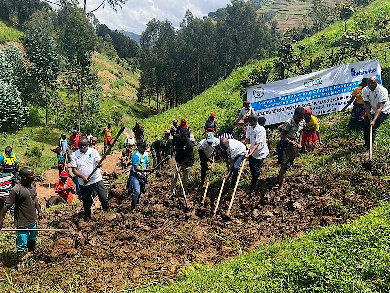 Umuyobozi w’Akarere wungirije ushinzwe imibereho myiza y’abaturage, Mwanangu Théophile ku bufatanye na bamwe mu bakozi ba WaterAid Rwanda, mu mushinga Swedish Postcode Lottery (SPL) bifatanyije n'abaturage b'Akagari ka Ruconsho, mu Murenge wa Rwerere mu muganda wakozwe muri gahunda y'Igitondo cy'isuku wabereye mu Mudugudu wa Kinkware aho batunganyije ahari isoko y'amazi.