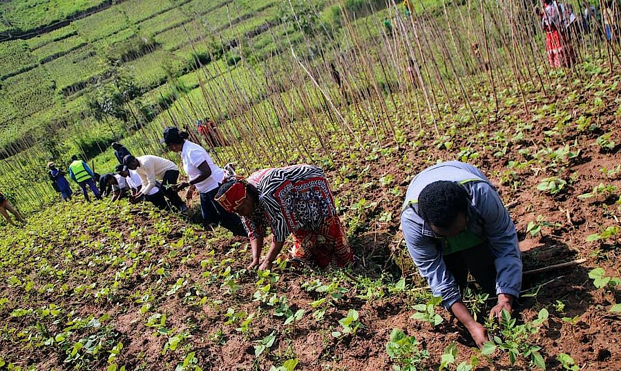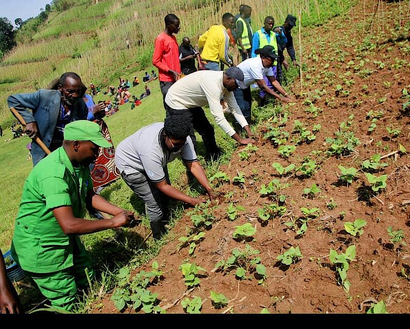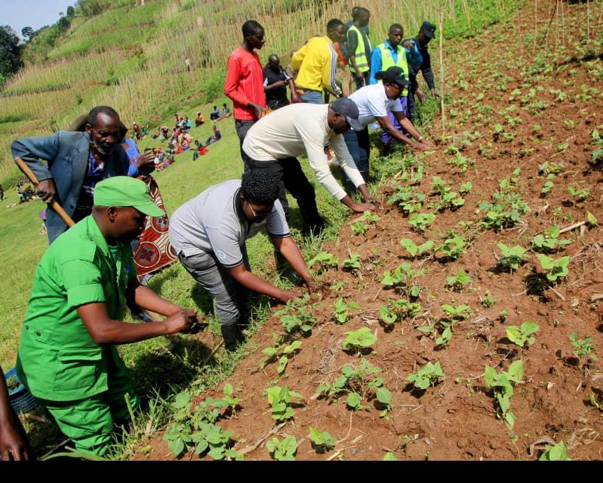 Umuyobozi w'Akarere, MUKAMANA Soline n'abagize bagize Komite Nyobozi y'Akarere na Visi Perezida w'Inama Njyanama y'Akarere, UWAMWIZA Catherine, bamwe mu Bajyanama bagize Inama Njyanama y’Akarere ka Burera; bari hamwe na Hon. Depite MUHAKWA Valens na Hon. Depite NYIRAMANA Christine basoje urugendo rw'iminsi itatu mu Karere ka Burera bifatanyije n'abaturage b'Umurenge wa Gitovu mu muganda wabereye mu Kagari ka Musasa aho bateye ibiti bivangwa n'imyaka.